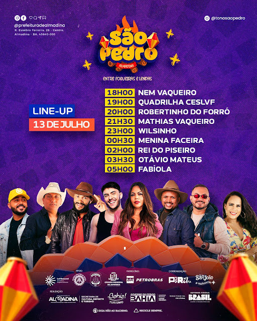 A Prefeitura de Almadina, sob a gestão do prefeito Marciel Pinheiro, divulgou oficialmente o lineup da tradicional festa de São Pedro da cidade. Serão quatro dias de muita música, cultura e animação, com destaque para a já consagrada "melhor segunda-feira da região", que promete arrastar uma multidão.